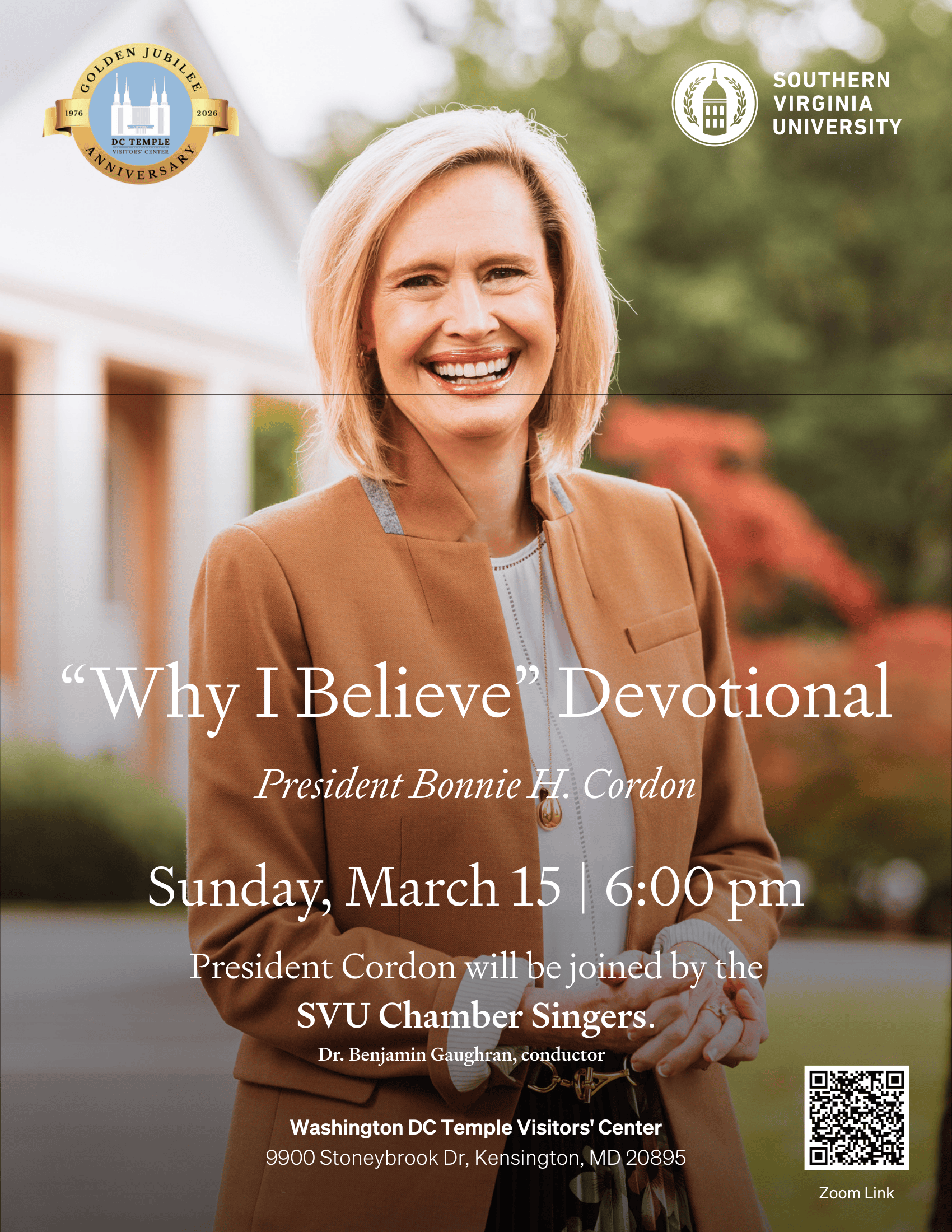 Why I Believe is a program that explores conversions and explains why members of The Church of Jesus Christ of Latter-day Saints hold to specific principles of the gospel. This fireside will feature conversion stories shared by Bonnie H. Cordon, President of Southern Virginia University, as she reflects on how the gospel of Jesus Christ has shaped and influenced her life. In addition, key doctrines and foundational gospel principles are thoughtfully explored.